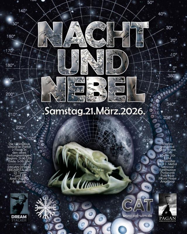 Die ultimative Party auf 2 Etagen mit 2 Dancefloors in den alten Festungsanlagen von Ulm. :NACHTHALLE: & :NEBELHALLE: Electro - Industrial - Wave - Gothic - EBM - Minimal Synth - Synthwave - 80s & 90s Postpunk . Cold Wave - Mittelalter / Folk - Ritual - Noise - Metal - Angstpop Beginn: 21:30 Uhr - 05:00 Uhr Pagan DJs, Dreamstalker DJs, Abby DJ Andi & Friends
